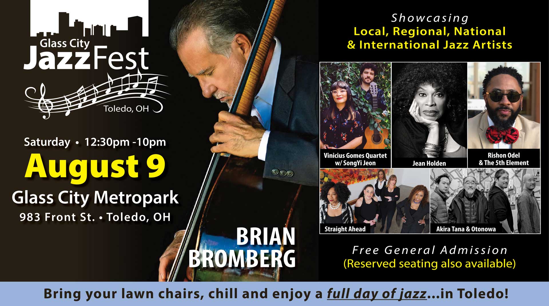 Admission is free and open to all ages. Bring your own lawn chairs or picnic blankets to claim your spot for the day. A limited number of reserved seating options are also available for those who want guaranteed close-to-stage views—check the Glass City JazzFest website for details. Expect local eats, cold drinks, and the best sunset view in town, all to the soundtrack of smooth, soulful jazz.