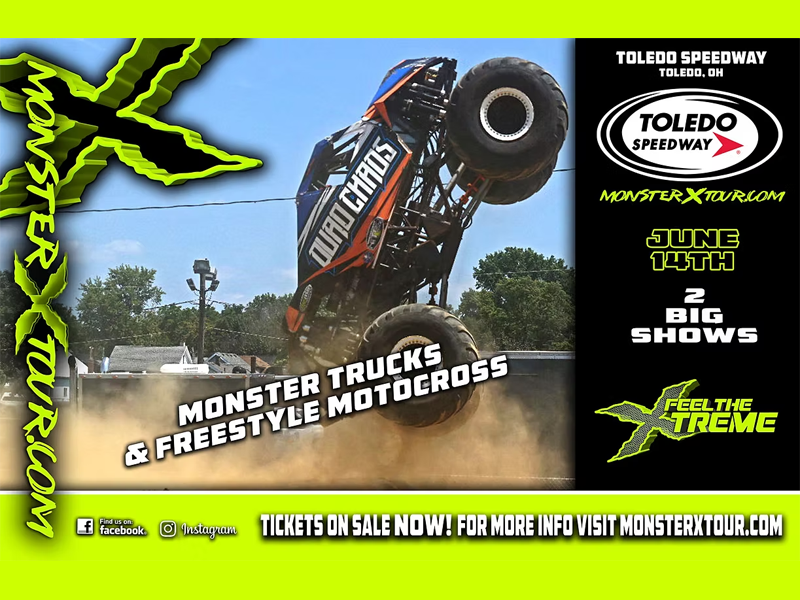 Toledo Speedway will be sports entertainment’s epicenter with the nation’s top monster trucks as they take over the speedway on June 14th for TWO monster shows! Come witness these incredible 10,000-pound, ground pounding giants compete in racing, wheelie contests, and then rock the house with amazing freestyle action during the Monster X Tour! Don’t forget about the EXCITING Freestyle Motorcross! Plus, you can meet the drivers and see the trucks up close at the FREE pre-event Autograph Pit Party!