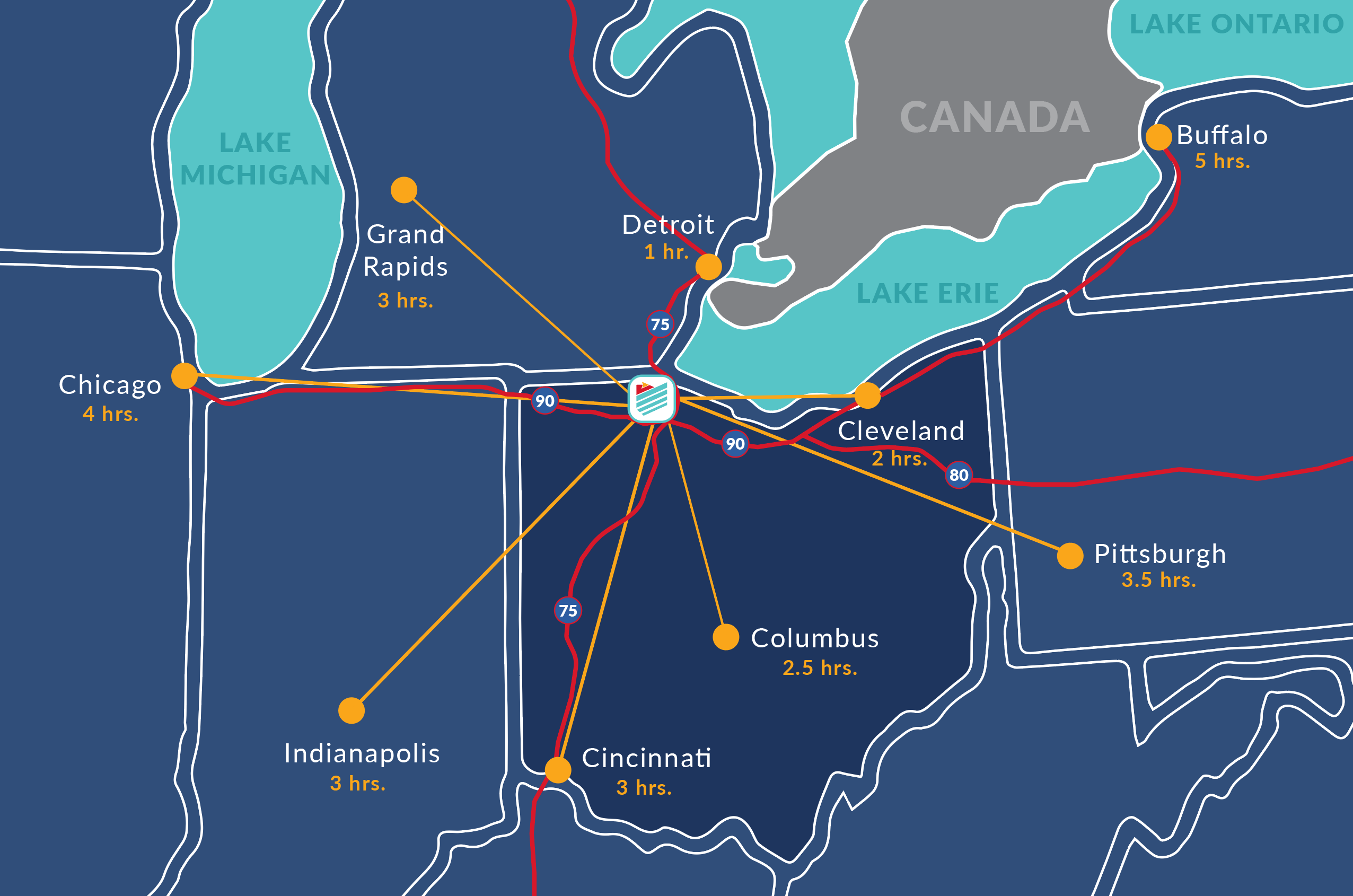 Thanks to our central location at the crossroads of I-75 and the Ohio Turnpike (I-80/90), Toledo is within a day’s drive of 60% of the U.S. Population.