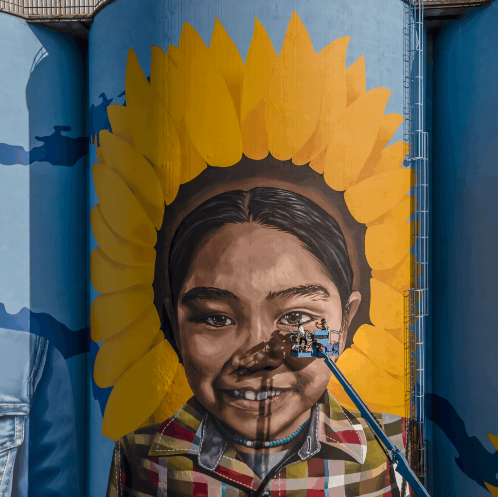 In 2019, the project team approached ADM with the concept, and the company quickly became a key partner. Through ADM Cares and the leadership of local facilities manager Jason Boyer, who served on the project’s steering committee, ADM provided both financial and logistical support. In addition to donating the 160,000-square-foot “canvas,” ADM and ADM Cares contributed $125,000 in grants to help launch and complete the mural.